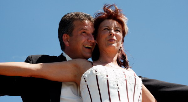 Vorheriges BildNächstes Bild Hochzeit_Mühlenfloß_Elbe_Parey_Magdeburg_Brautpaar Brautpaar auf dem Mühlenfloß Elbe-Parey beim Einlaufen in den Ehehafen